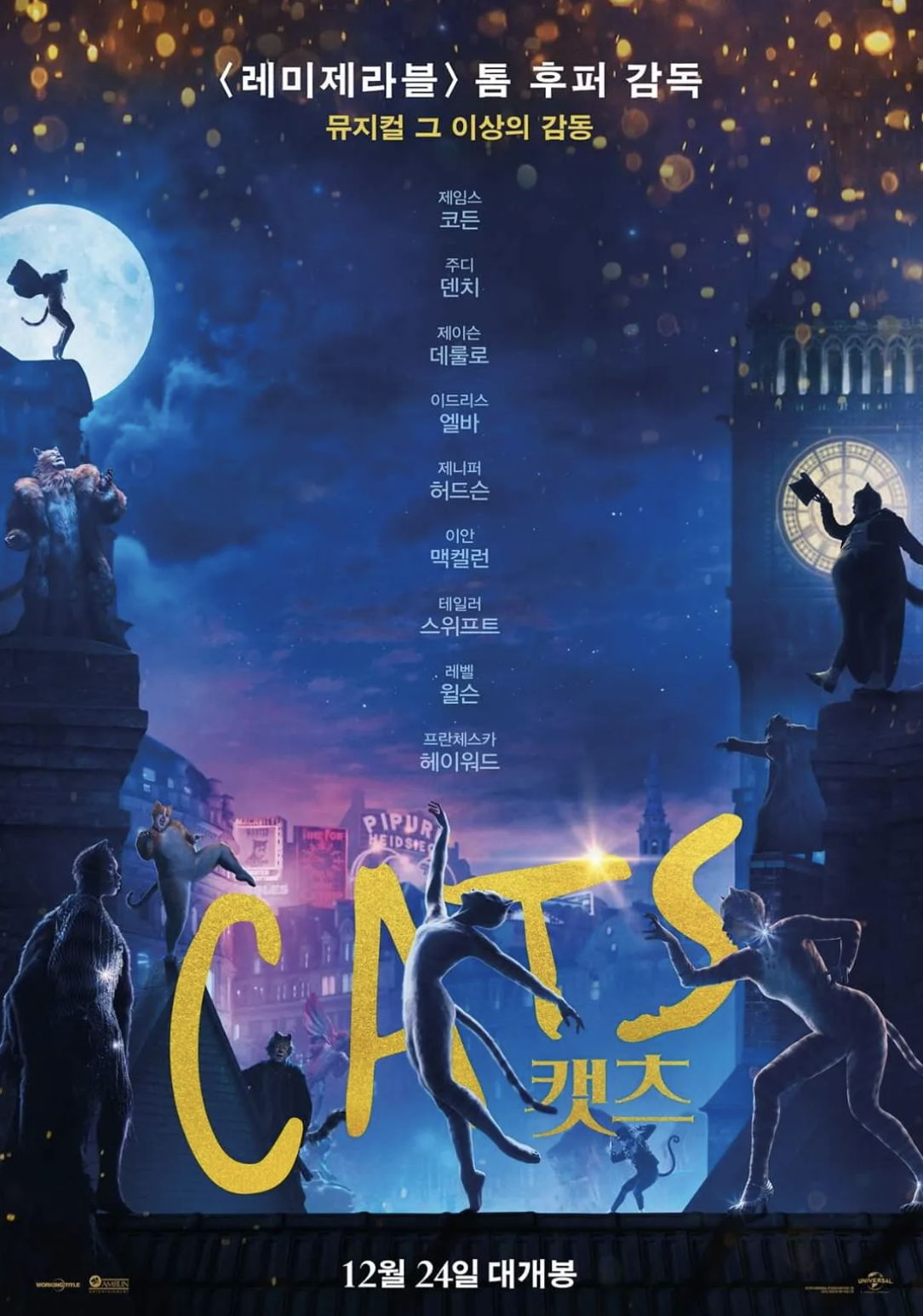 <레미제라블(2012)>로 아카데미 작품상을 수상한 톰 후퍼 감독에게 <캣츠>는 명백한 오판이자 실책으로 남게 되었습니다. 그의 가장 큰 실수는 원작 뮤지컬 <캣츠>의 본질을 이해하지 못한 채 영화화를 시도했다는 점입니다. 원작 뮤지컬 <캣츠>는 전통적인 의미의 서사(narrative)가 없는 작품입니다. 이는 결함이 아니라 설계입니다. 뮤지컬 <캣츠>는 스토리보다 고도로 훈련된 배우들의 고양이 연기와 무용, 그리고 관객과의 직접적인 교감에 중점을 둔 '체험형 쇼'입니다. 배우들은 객석 통로를 누비며 관객에게 말을 걸고, 손을 내밀고, 고양이처럼 다가옵니다. 이 현장감과 교감이 뮤지컬 <캣츠>의 핵심 정체성입니다.